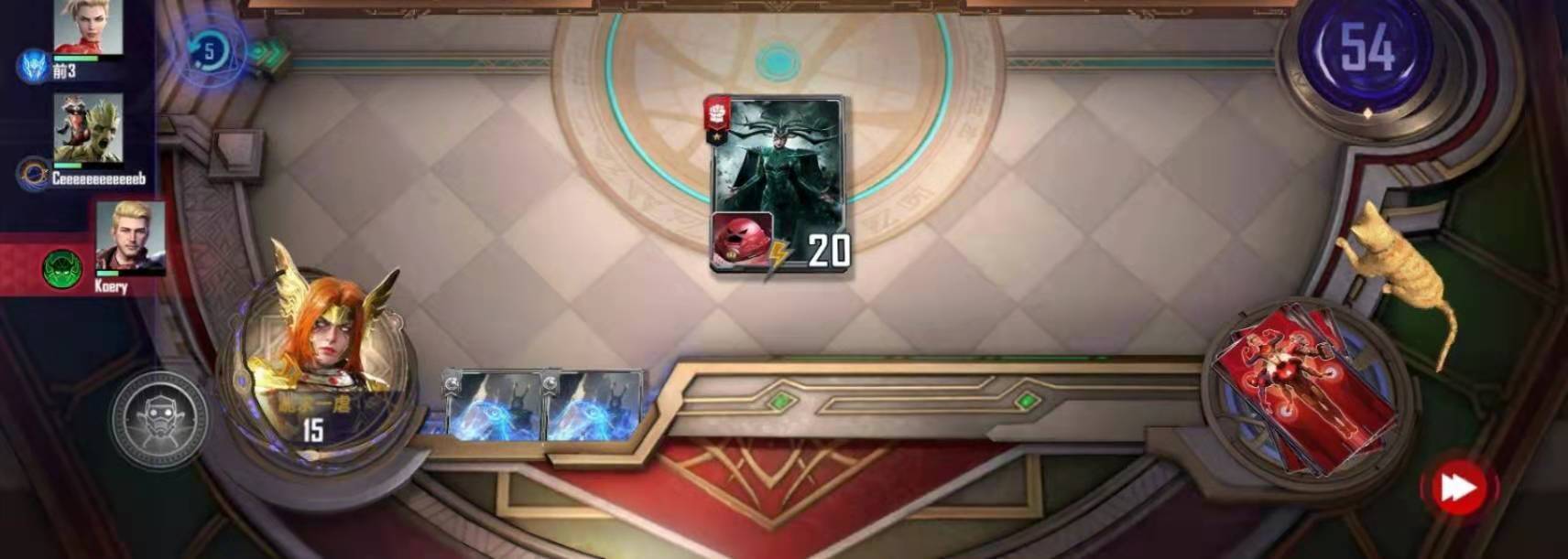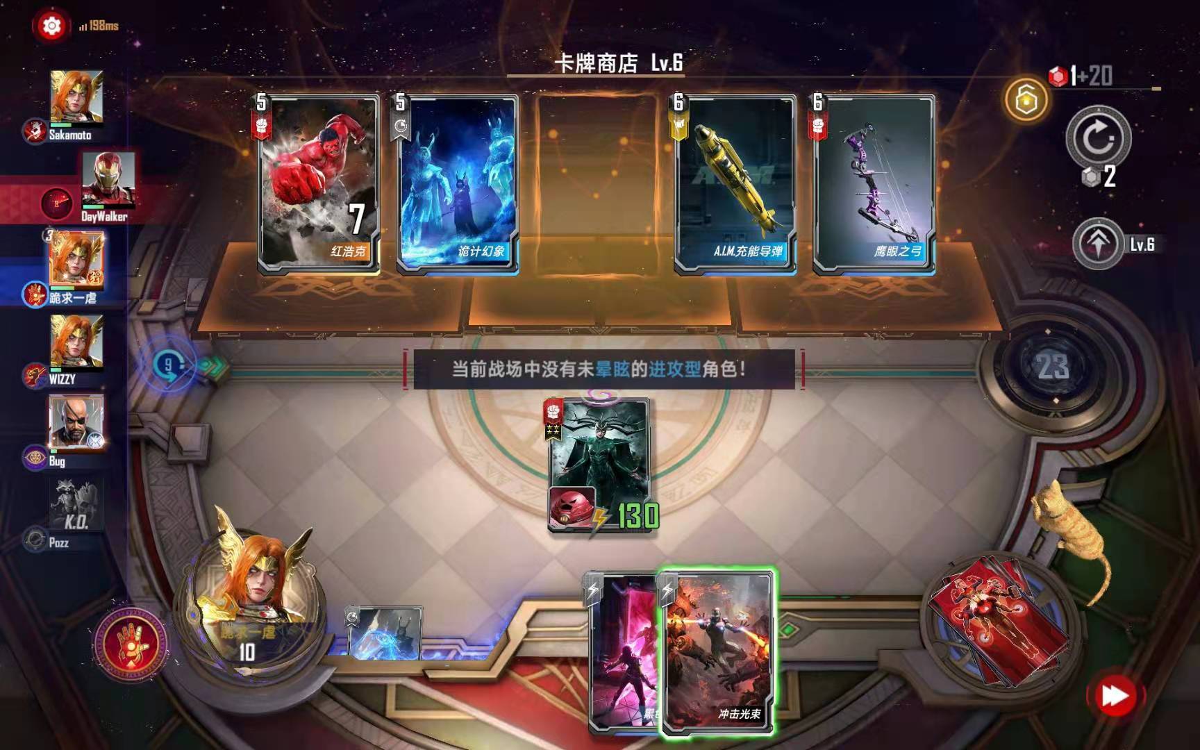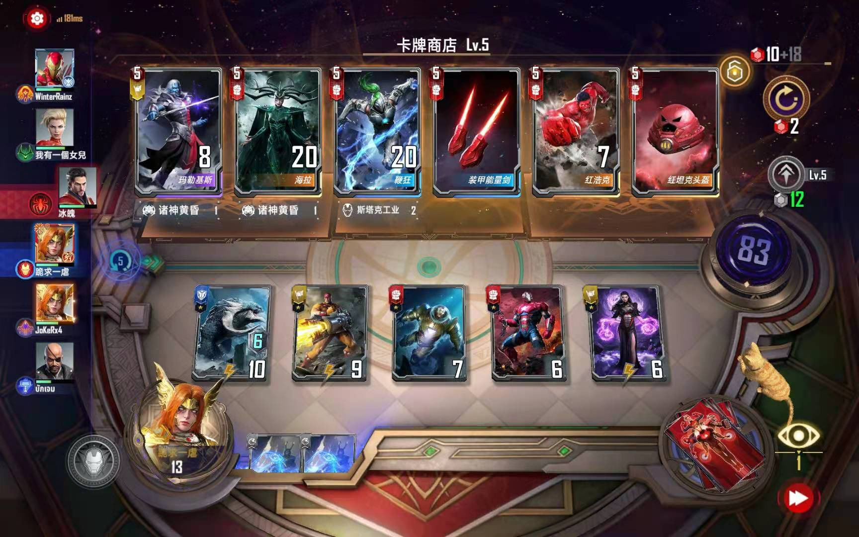(2)因为大部分的卡组都带了钢铁侠,所以本卡组最好的两个技能“天才创造”和“战甲升级”一般都不会送宝石,所以本卡组速五本以后那个回合是很危险的,这也是本卡组携带一张“紧急缩小”的原因。这个时候在升级商店的同时,尽可能保证场上攻击最高就行了,和其他速五本的卡组不同,囿于经济的原因,本卡组一般不会在速五本的回合刷新商店。