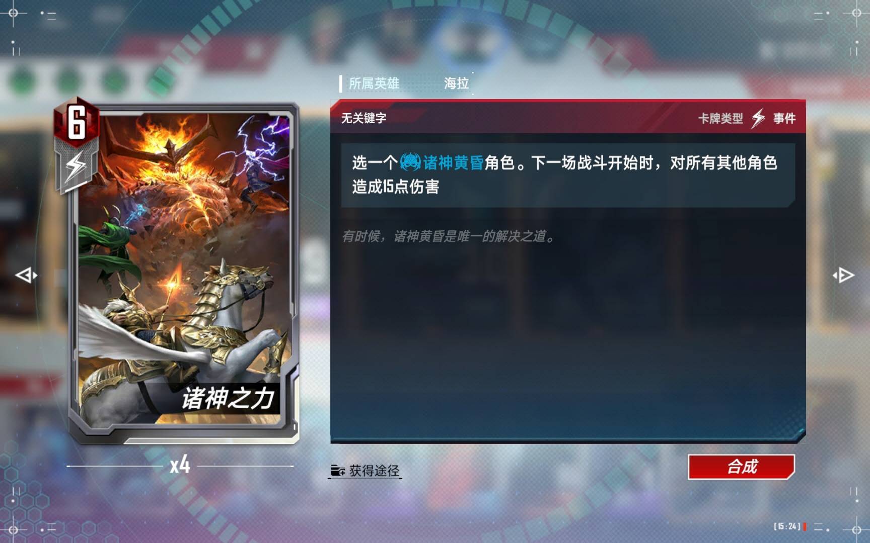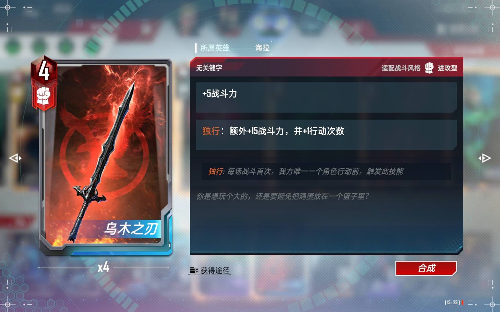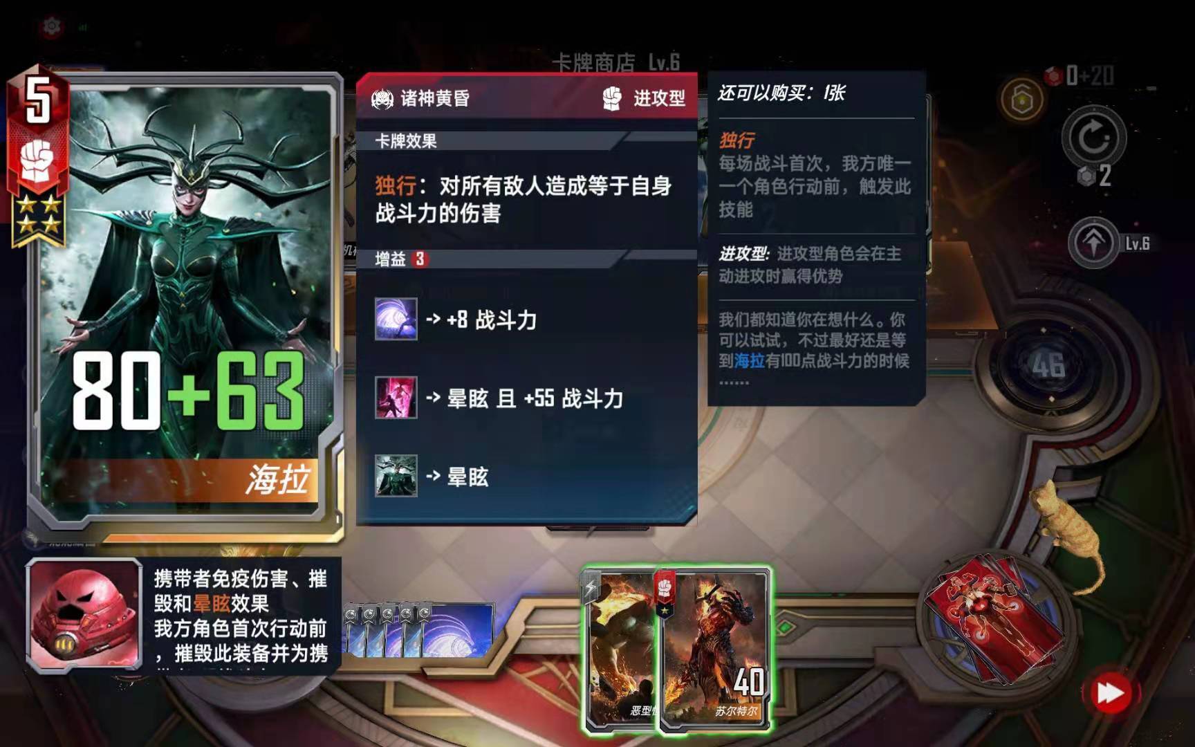 (3)如果选择了“天才创造”技能,本回合一般绝对不会使用的,用了也没钱买。要等到下一回合经济充足了才使用。运气好的时候经常能直接刷出海拉和红坦克头盔来,或者是装甲能量剑,就算只刷出一个海拉,也可以配合场上的守护型随从直接独行。