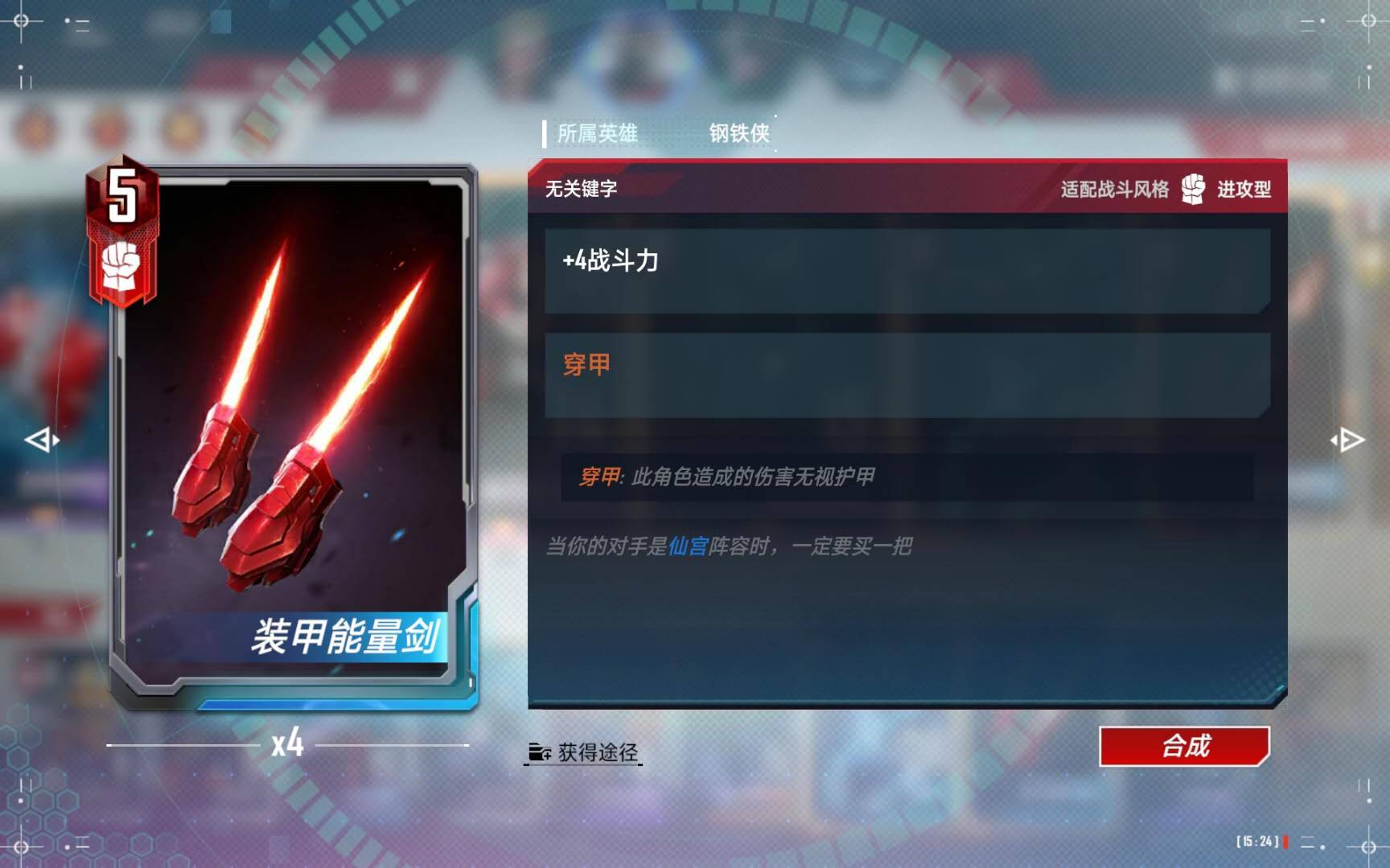 九、装甲能量剑(穿甲):1张,这张卡是专门对付复仇者的,就算是八星复仇者没有雷暴的复仇者直接一波秒掉,加了雷暴的八星雷神也有一战之力。打格鲁特用这把剑也非常好用,开打以前一定要看对方阵容选择武器。这张武器也可以作为没有摸到红坦克头盔的时候,独行武器替代品;