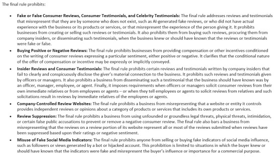 第二项规定明确禁止“以换取正面或负面评论为目的的购买行为”,即无论是直接的金钱补偿还是其他形式的激励,只要这些补偿或激励是以撰写消费者评论为条件,均属禁止之列。除此之外,还包括诸如禁止“内部人士评论和消费者证言”、“公司控制的评论网站”、“压制评论”以及“滥用虚假社交媒体指标”等规定。