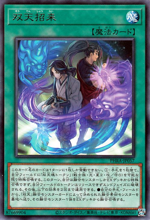 ●这张卡能一次召唤5只「双天魂トークン/双天魂衍生物」,满足「弱肉一色/弱肉一色」的发动条件,也使得「弱肉一色/弱肉一色」这张以前被认为没什么用的卡突然进入了玩家们的视野。在3期有不少和通常怪兽有关的卡,但其中好些都会特意加一句“衍生物除外”。或许是因为「弱肉一色/弱肉一色」的发动条件本身在「双天招来/双天招来」登场之前就很难达成,所以当时的设计者或许就认为衍不衍生物都无所谓了。