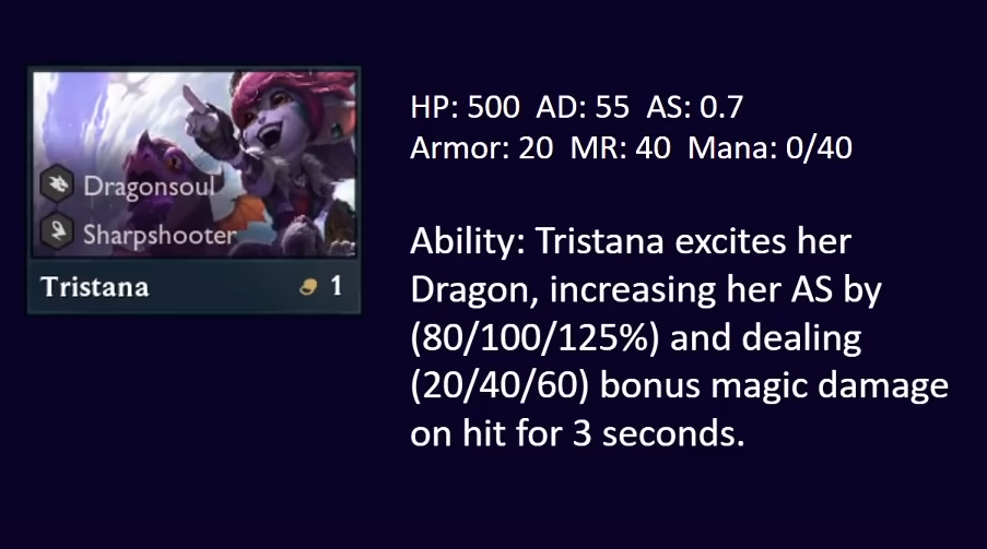 生命值:500;攻击力:44;攻速:0.7;护甲:20;魔抗:40;法力值:0/40