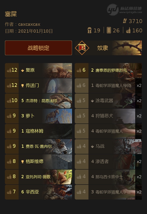 加上战术一共能打出6锁,可谓唯一噩梦。而加强后的伪装大师也是一个非常不错的引擎。这套牌基本是现在锁国的标准卡组,已经无法再完善了。双滤牌在r1的表现堪称变态,除了莫拉汉姆家猎手,如今帝国的铜卡在r1没有一张是亏模的,先手的能力非常强势。奴隶这个战术除了打气宗,其他时候的表现都非常出色,有时候甚至可以提供修点打致命一击的效果。我这两天靠锁国上了快100分(还是全程一个唯一没遇过的情况),真正沉3金以上的情况可能也就一两次,可见双滤牌(唐泰恩的罗德烈克+致命一击)的检索效果还是非常强力的。