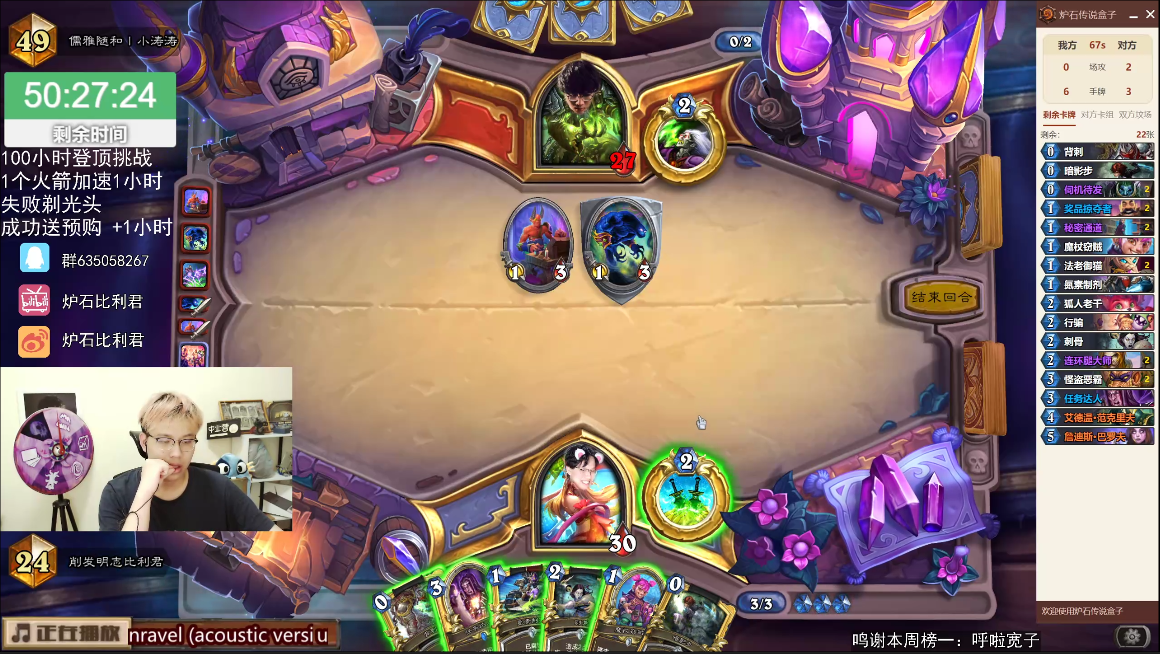 这里讲几个核心要点:后手二费硬币打了有节奏,能起跳就起跳,不要贪任务达人。留着容易被先手牧师313换牌把手里背刺暗影步通道全打掉,这种情况就直接输了。