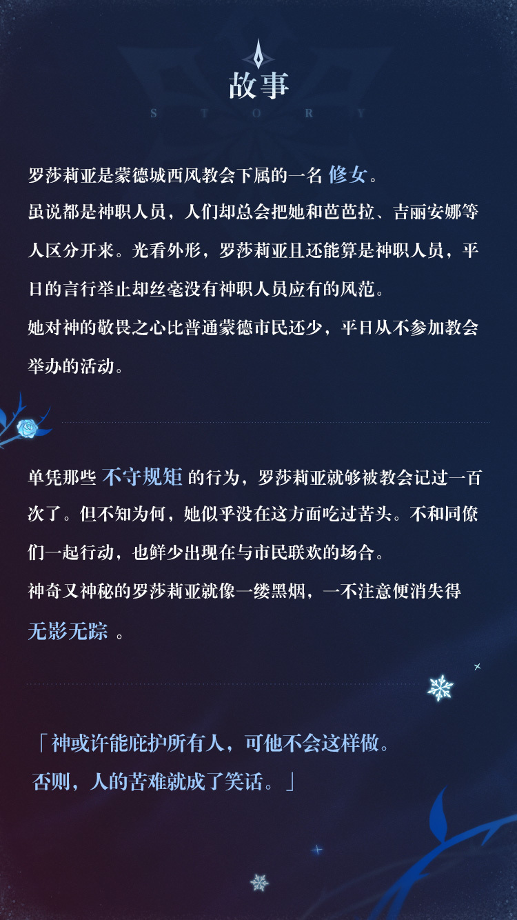 对神的敬畏之心比普通蒙德市民还少,平日从不参加教会举办的活动。她犹如一道黑影,穿行于蒙德城各处。