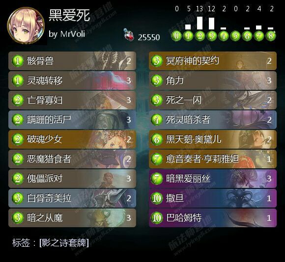 这套构筑则更加倾向于前者的游戏计划,由于黑爱本身的特殊性,使得关键的中立核心组件,除了角力由于需要重复打出而携带复数张以外,诸如俞音和撒旦的其他组件全都只携带了一张。通过本家携带诸如亡骨寡妇、吃货(恶魔猎食者)、灵魂转移等强力过牌件,前中期在常规展开保证生存的同时过牌找黑爱,从而做到可以准时7C打出黑爱,并适时打出角力,完成绝对护脸的同时直接检索撒旦俞音与巴哈,以及牌堆中剩余的角力,将对局拖入打出撒旦的冥河构筑,结合黑爱俞音蹭血带走对面。