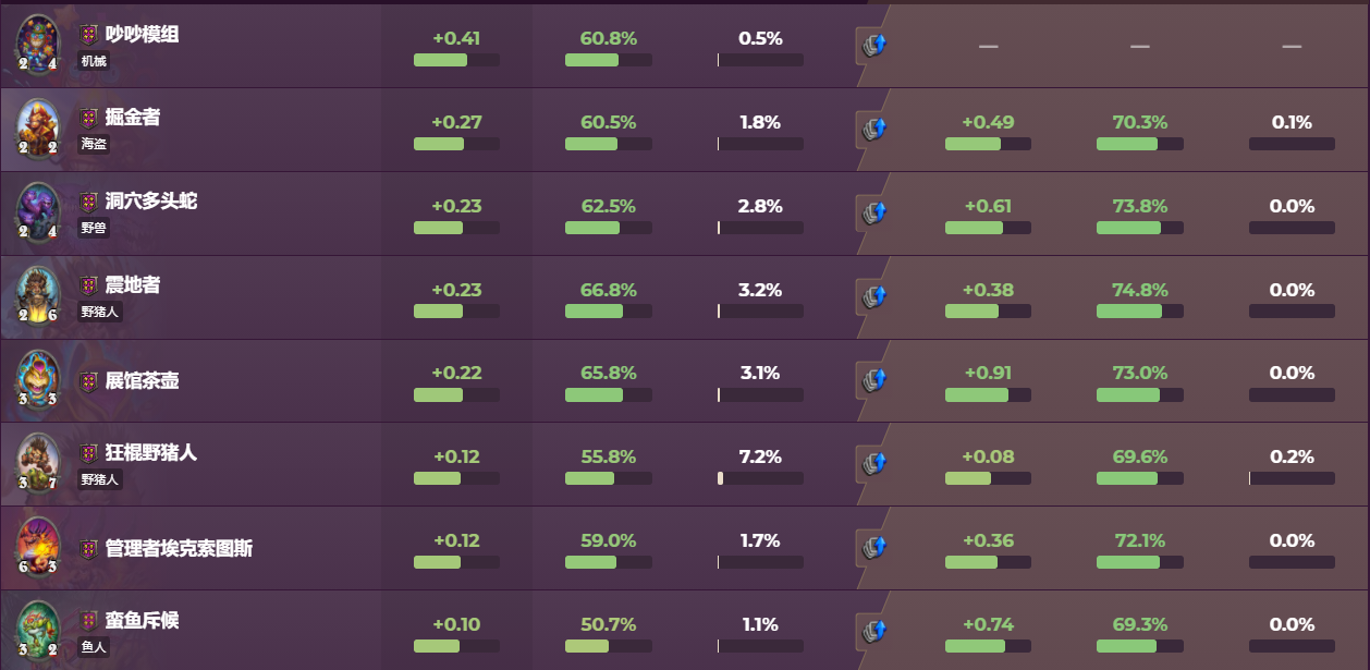 后面的英雄选到了真的就是掉分的,就不做参考了。说点个人感受,没鱼的时候别玩女巴,就是当你野兽和鱼人被ban一个的时候我宁愿选个萨隆这种混个分也不想玩女巴,因为没有赌到理财大概率7,8。而且没鱼的时候女巴碰五选择也少了,没有铜须鱼王这种质的提升。然后就是我现在这个分段的拉法,我大概8600左右,玩拉法姆局局被人针对,遇到的托奇起手理财跳三还要再卖一个怪点个技能,而且五块钱遇到的英雄看到你是拉法他要牌一般,肯定上本没得商量,加上4块钱的时候还有可能遇到树人和钩牙船长这种不下怪的,反正节奏很容易崩掉。而且现在拉法姆偷得不好,就是20-25血点到四本开玩,不碰这局就无了,这是我的个人感受。