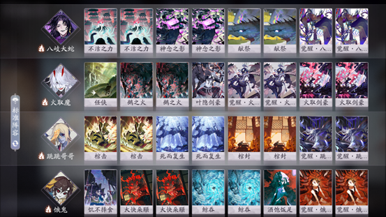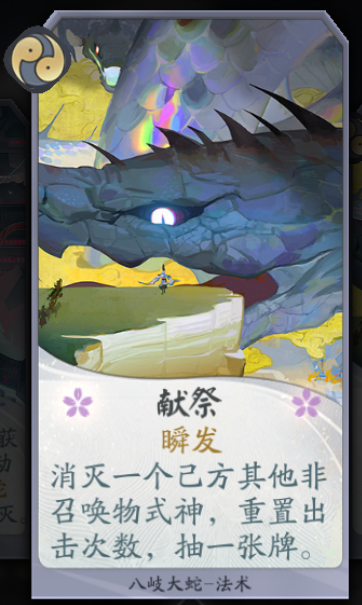 献祭:消灭一个己方其他非召唤物式神,重置出击次数,抽一张牌。与不知火的重置一样可以增强我们的攻击频率,而消灭式神产生的蛇魔配合我们的神念之影也是一个免费的出击频率,只要我们发挥蛇魔的优势牺牲式神对我们就不会有太多的影响。
