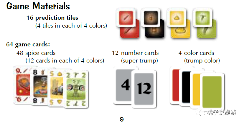 同样需要预估出自己会吃几墩牌拿取对应标记然后游戏中消除。颜色一共5色,其中红色将牌,要考虑红色将牌不讲道理的吃牌,所以可以观察大家拿取什么标记,来拿标记和出牌。