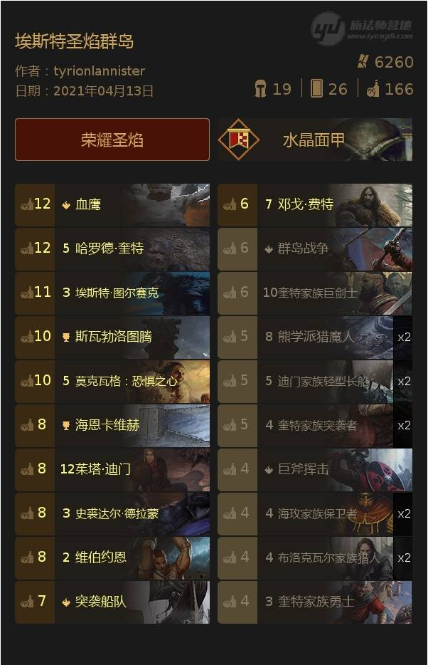 这套是我自己搞出来的,放在这里就当是夹带私货了。整套牌其实是不完善的,只是作为一个思路的展示,也抄袭了别人的水手构筑,通过交流也发现有人在我之前组出来过,所以并非原创。而且很有趣的是,我把群岛完成了北方。13资源点的领袖说明这是一套以前组出来的,目前恐惧之心也取消了水手的词条,所以这套牌应该会更弱。
