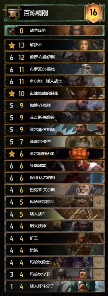 这里贴出的是一张比较老的爆牌思路了,当时的领袖是战略撤退。之所以选这一套只是因为这套有独角兽(4战力10资源),玛塔·乌莉(6战力9资源),斯崔葛布(5战力9资源)这种让双方同时从牌库里面出单位的牌。
