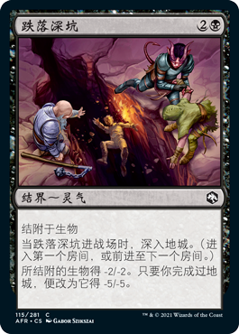 地城是一个非线性的收益过程,而且并非一个地城越往后的收益就越好,在笔者看来,这是一个不稳定的收益。而且介于AFR深入地城相关单卡的密度以及payoff的强度,想以走地下城赚取足够的资源压垮对手并不现实,不断使用亏模生物丢失的节奏在这个系列也比较难以找回。以笔者的经验,完成一个四层地下城是较难的,而走完最长的那个地下城几乎是不现实的,这让一些和深入地城相关的单卡看起来很美但没有什么关键作用(比如说漫荡游唱人和移位兽这种单卡),即使有机会在生物战中避免交换掉他们,几次深入地城带来的资源也不够多。