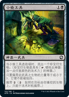 小偷工具也是不够好的单卡,虽然它能为你我们供一个珍宝然后让蛇人毒刃手以及魂刃者探子这样的生物打过去,但一旦我们需要处于防守端或者race战它就毫无作为了。这点让它远远弱于死神神符,死神神符可以让我们在防守端或者race战中持续回血并吸引对手做出挡死我们的烦人的进攻者这样错误的决定。