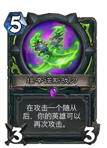 在第一波平衡补丁上线之后,骑、贼的进攻节奏以及愚人法的上限都遭到了不小的削弱,但其强度仍然在线,不至于能压着其他职业抬不了头。魔钢节奏瞎的兴起正是在这一阶段,而其中核心系列新卡伊利达雷审判官功不可没,在环境降速之后,这张新“暴龙王”以其令人咂舌的终结能力渐渐带领起除吸血瞎外的新形态构筑,而为了更好地过渡到八费完成审判官斩杀,当时的恶魔猎手玩家选择了奥达奇战刃-埃辛诺斯战刃-刀锋舞娘的咬人体系,同时也多少开发出了伊格诺斯配合奥达奇战刃与冷酷追杀的“剑宗吸血”功能,在当时天梯主流卡组为圣契骑、突袭战这类拼随从身材的大环境下,中速瞎凭借刀锋舞娘的返场能力和古尔丹之颅的高效过牌有存在的底气,直至最后,天梯高分段还曾兴起过携带演员大接力的中速瞎,可以说韧性十足,只是还没得到充分的普及,大家就迎来了第二波平衡补丁的上线。