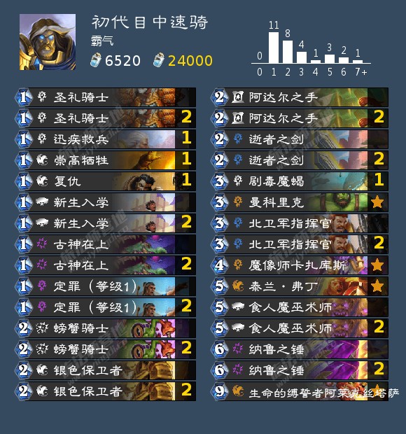 正如前文所说,中速骑是在逝者之剑削弱之后异军突起的卡组,竞技场般的连续拍怪虽然略显无脑,但是却重重地打在了环境中期解牌匮乏的痛点之上: