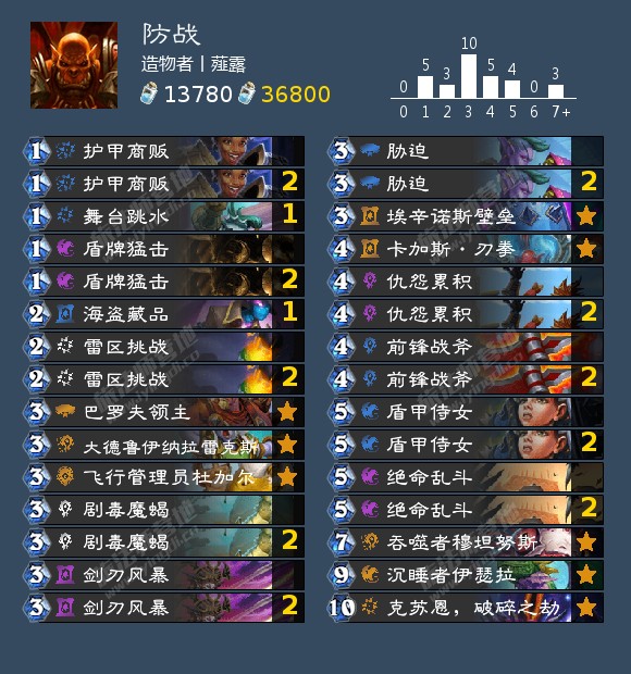 防战的卡组差不多就这个样子,我本人没有玩过,因此不是很好评价。不过从看直播云的经验看来,这套卡组还是太看抽的牌了,而且绝对强度也没有太高。