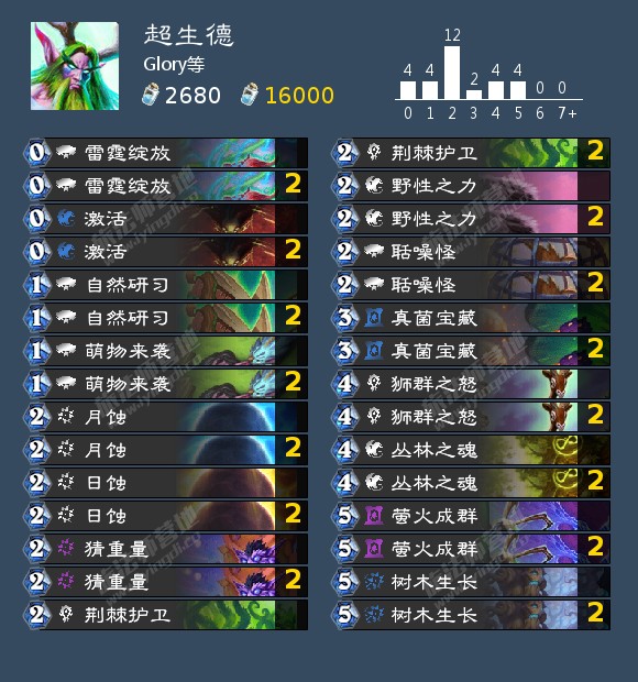 但也有很多人喜欢带一些单张,比如去掉一张萌物来袭、丛林之魂等,带一些单张的随心口袋、灵魂指引、飞扑这些牌。我个人本着“相信它就带两张”的原则,是不喜欢这类看起来充满一种犹豫不决的气息的构筑的。超生德玩法较为简单,操作灵活度大,同时和上面两种德鲁伊比对牌序的要求要低得多,因此也是最为热门的德鲁伊形态。
