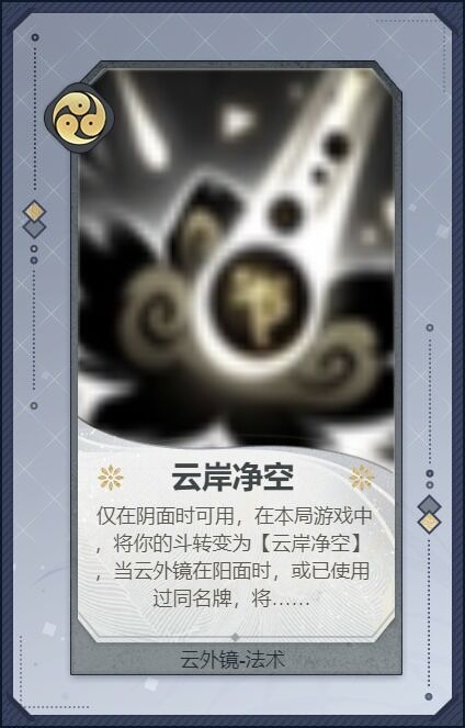 云岸净空(法术):仅在云外镜在阴面时可用,在本局游戏中,将你的【斗转】变为【云岸净空】,当云外镜在阳面时,或已使用过同名牌,将此卡改为【苦海浮生】。