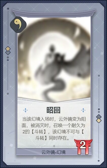 然后这两张是和云外镜基础能力有关的衍生幻境,当你场上的幻境是【斗转】时,云外镜会变成阴面;而你场上的幻境是【昭回】时,云外镜会变成阳面。而且【斗转】在被消灭后是可以自动再召唤一个【昭回】的,反之亦然,所以在敌方消灭我方场上【斗转】或【昭回】时,我方云外镜可以切换形态,这也能增加与对手的互动性,也对幻境队过于自闭的问题稍微改善了些。