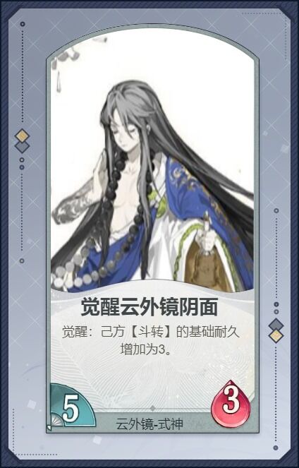 基础能力,云外镜有两个基础卡面,他在升到1勾时,玩家可以自主选择是要阴面还是阳面,而云外镜在阴面和阳面时,身材数值刚好是相反的,而且使用牌的效果也不同。