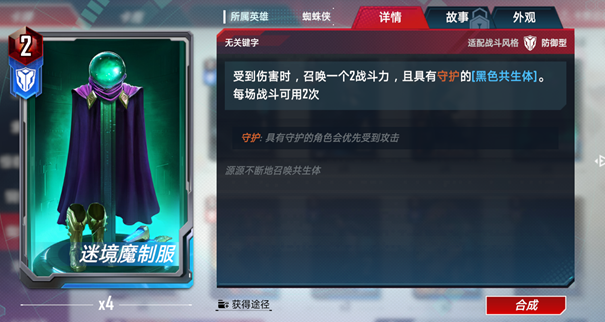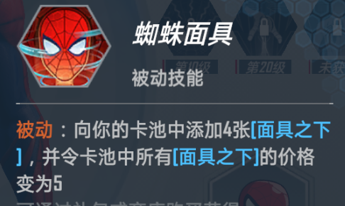 关于这张卡牌的效果在定义的时候有一处需要再明确一下的是,摧毁一个角色可以触发他的阵亡效果,这里用蜘蛛侠举例。当战斗开始之前面具之下摧毁蜘蛛侠可以触发他的增益效果(因为没有敌人,所以没有晕眩效果)并且这个增益可以永久保留在被buff的角色身上。而且蜘蛛宇宙的阵营技能蜘蛛面具还可以让这张牌变为5费。