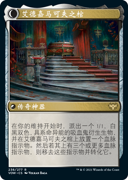 由你操控的其他生物得+0/+1。由你操控的其他吸血鬼得+1/+0。当艾德嘉马可夫死去时,将其在其操控者的操控下移回战场且已转化。
