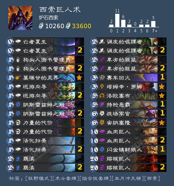 卡组综合强度是除了齿轮法以外最强卡组,为了对抗新进t1萨满加了一张持枪恶霸可以有效封印所有战吼,比活化龙息打其他卡组舒服还可以封鱼人流天地反(毒鱼套),这套卡组很考验大局观打法多变,每个对局打法都不同,特别是对抗偏慢的卡组。