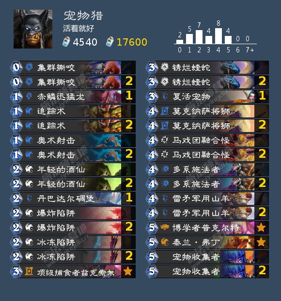 攻略就是起手找4个5还有追踪术,如果起手就有,那集群撕咬和小熊猫也留下。然后就是尽可能下宠物收集者再回手,避免被解的可能性。