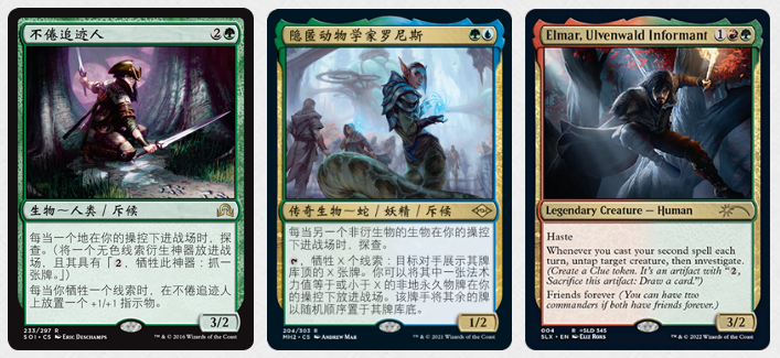 线索衍生物表现地十分亮眼,也为我们打开了把衍生神器做为工具的设计空间—我们能绕着一个有着基本效应、且有风味和名字的神器设计系列。和之后的衍生神器不同,线索衍生物和一个关键字机制相连结—调查。技术上来说,我们可以派出线索衍生物而不需要先进行「调查」,但那个字实在是太有风味了。