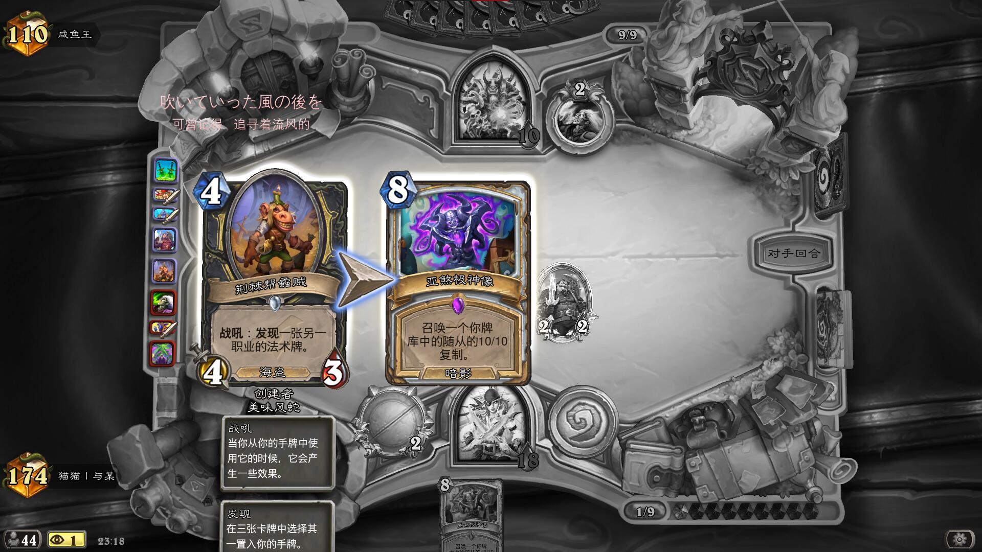 首先是通用留牌,对于所有对局,我们都需要留一张1费能出的小海盗,222海盗空降歹徒除了对阵术士要防亵渎造成亏牌,其他的对局都是必留的,再就是,3费挂刀是一个很重要的节奏点,起手在1费有怪下后,要尽力保证3费及以前能挂上刀,但是121锈水海盗的buff不用贪也很少能贪到(除非1费海盗2费231抽刀3费跳币秀水挂刀),为了保证2费有事做,在有231洞穴探宝者的情况下,我会把刀换掉,2费再抽上来。