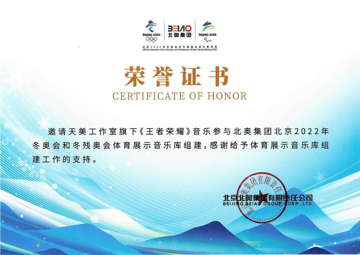 全面回顾本届冬奥会和冬残奥会各方运动员的精彩表现,天美工作室旗下《王者荣耀》有幸参与音乐相关工作并获赠荣誉证书,在此谨向北奥集团致以由衷的感谢。《王者荣耀》今日的成绩离不开玩家的支持与喜爱,为了回馈社会各方的肯定与鞭策,《王者荣耀》团队将保持自我革新,锐意进取,再攀高峰