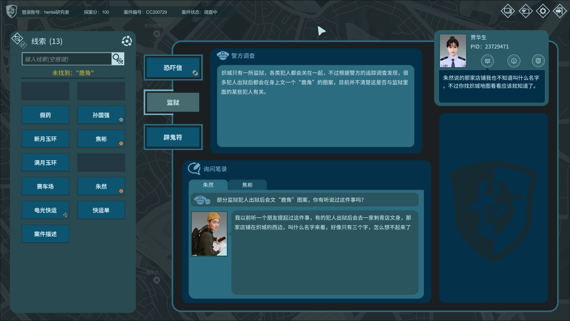 在渐渐深入的过程我们可以了解各个嫌疑人,对其质问某样线索,也可以查询嫌疑人之间的关系,得益于现代科技的发展,我们还可以动用指纹对比系统。