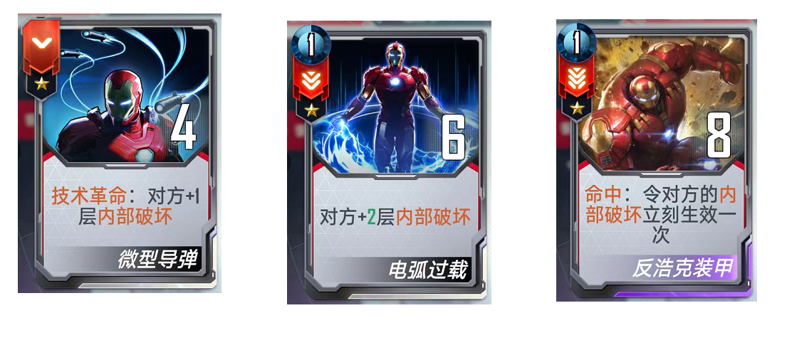 内部破坏可以对对方造成持续可叠加且无法被护盾抵消的伤害,因此可以通过频繁打出内部破坏牌来叠加层数,并且在在层数足够多时打出【反浩克重拳】,对对手再次造成猛力进攻。为了防止自身被秒杀,可以搭配回血和护甲牌保证自己的续航。