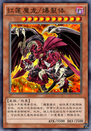 【红莲魔龙/爆裂体】是【红莲魔龙】的进化版,【爆裂体】的共通变化是星级上升两星,攻击力守备力各上升500,被破坏之后复活本体。