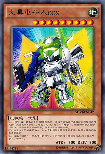 「文具电子人」怪兽统一为地属性·机械族,攻击力·守备力都为500,而等级则随着名称上的编号同步递增。系列内包括了灵摆召唤与同调召唤的系统。