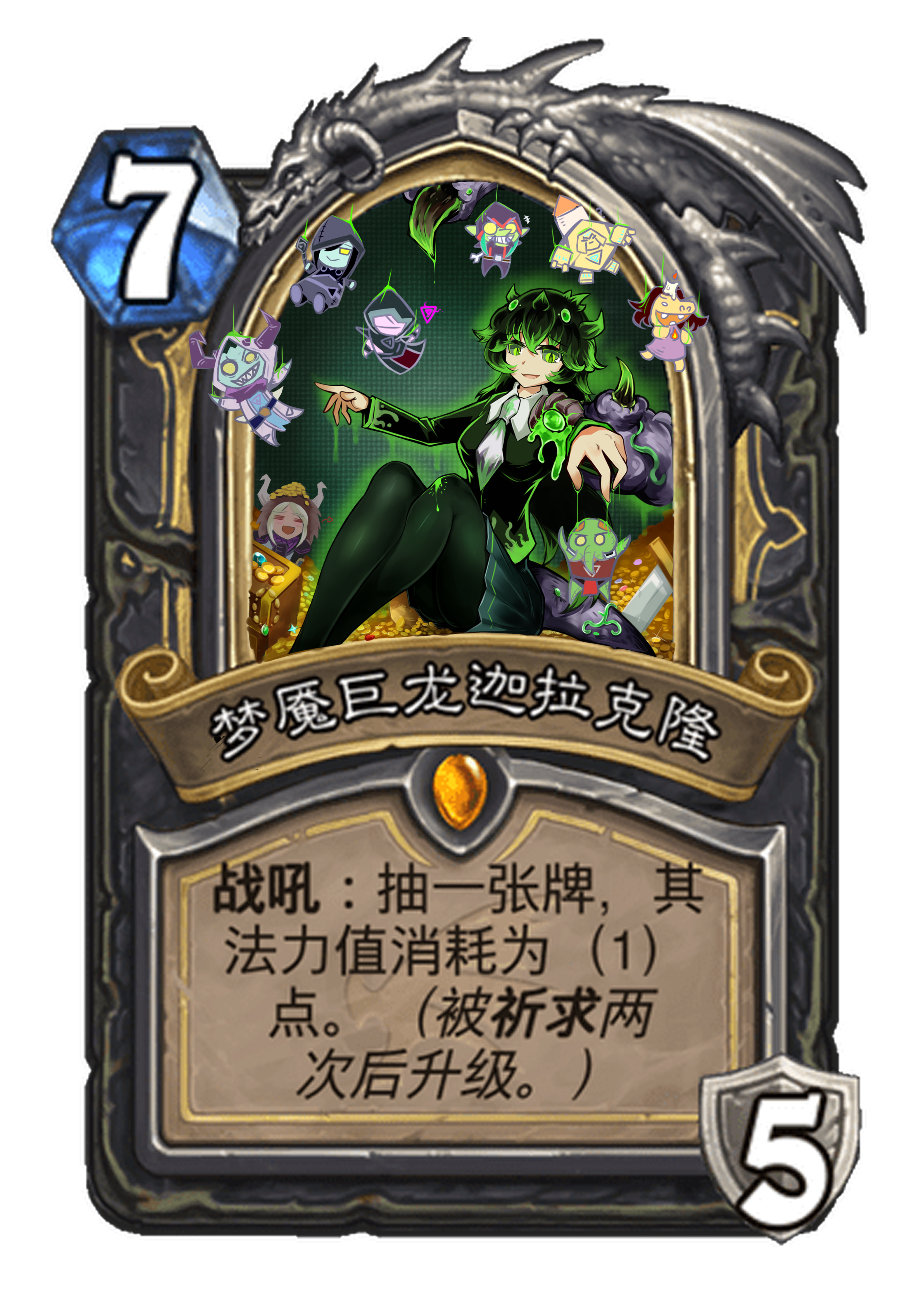 在20年11月初开始工作填坑画的jk版无敌巨龙迦拉克隆!作为为数不多的直伤jk,配合老海盗战的冲锋牌有段时间强度还蛮高的,祈求-3砍着砍着英雄牌就升满了,变完身数张+4+4的冲锋怪就会往脸上撞,进攻性十足。因为表现不错结果某次补丁废墟之子还砍了下费用,让那段时间月底结算给了张金色332的我倍感开心XD