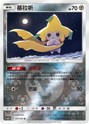 4张基拉祈:先手的救命宝可梦,卡组的润滑剂。实际对局中基本上会拍下2张左右。携带四张是因为这卡组无比希望基拉祈开在前场。根据概率四张基拉祈会比三张基拉祈多10%概率起手开在战斗场,即十把游戏会多一把,因此满上。