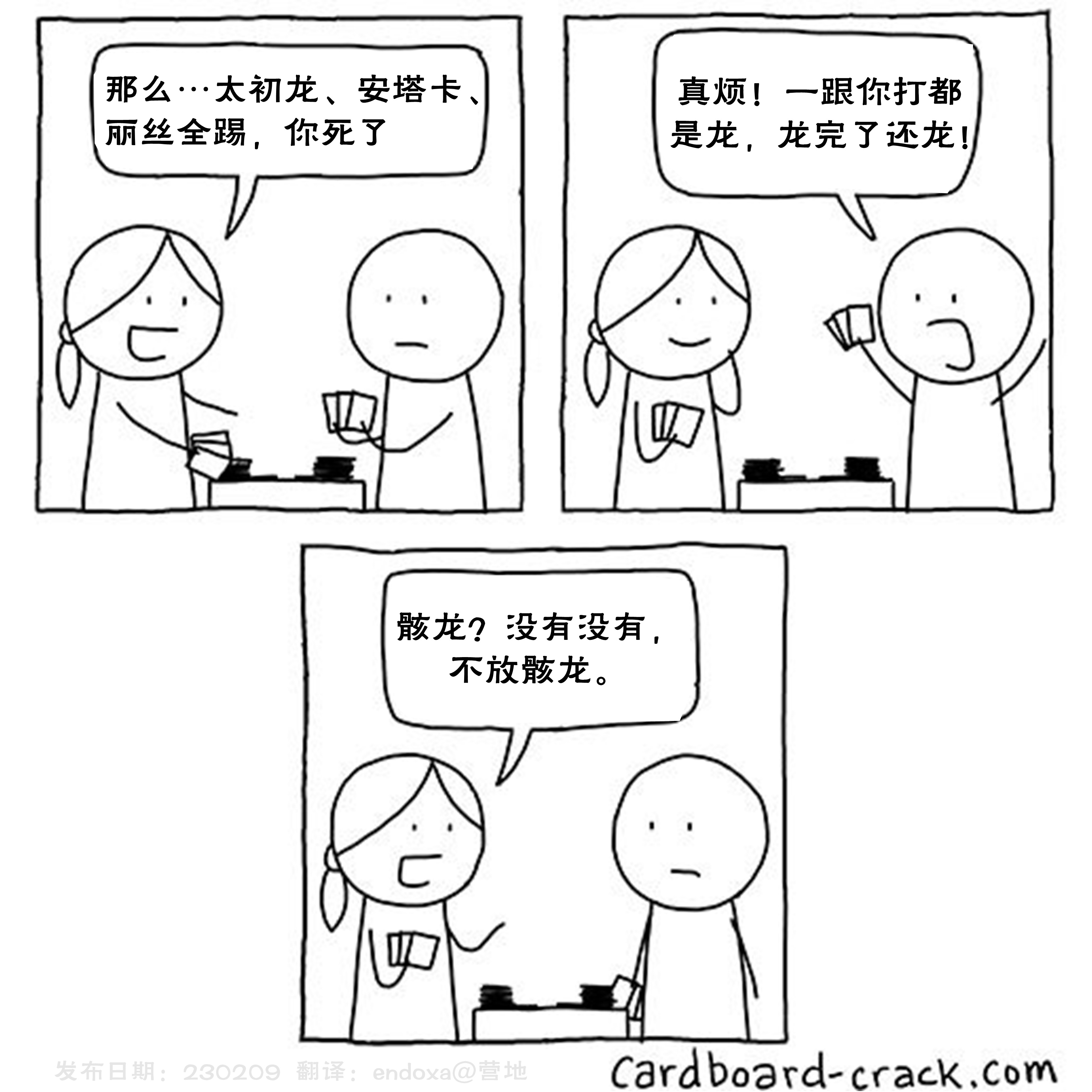 230209《龙龙龙》涉及卡牌:太初龙、龙王安塔卡、醒眠龙王丽丝译注:原文是龙(dragon)与拖太久(drag on)的谐音梗