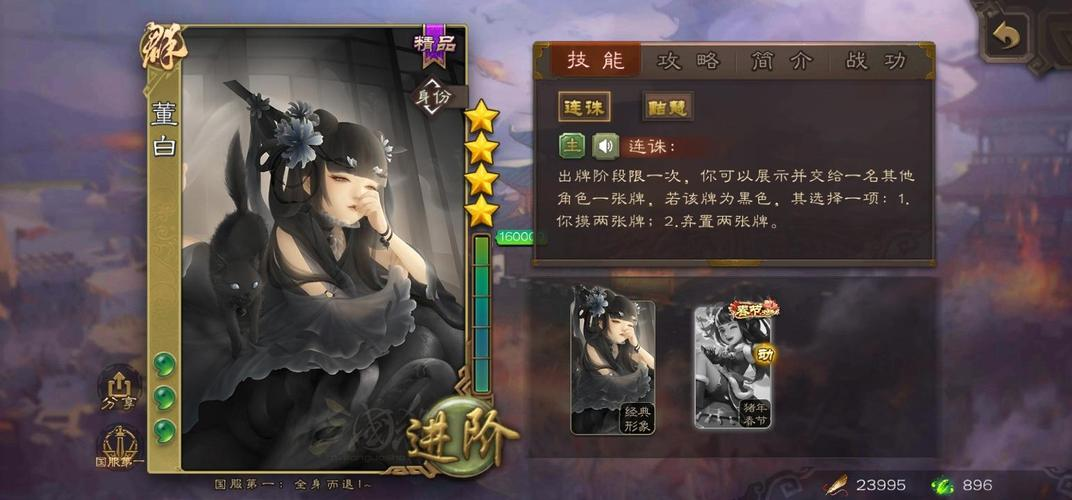 董白面对一些摸牌白武将时,有不错的发挥,但是在面对过牌流武将时就显得有点弱。首先就是发动【连诛】需要弃牌,如果敌人选择弃牌,那么董白就会损失1张牌,此时董白再使用牌,就会造成手牌减少,防御能力降低。对于过牌武将而言,最怕的不是弃牌,而是不能摸牌,所以董白对他们的威胁其实不大。