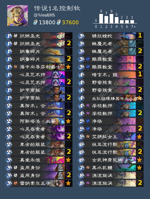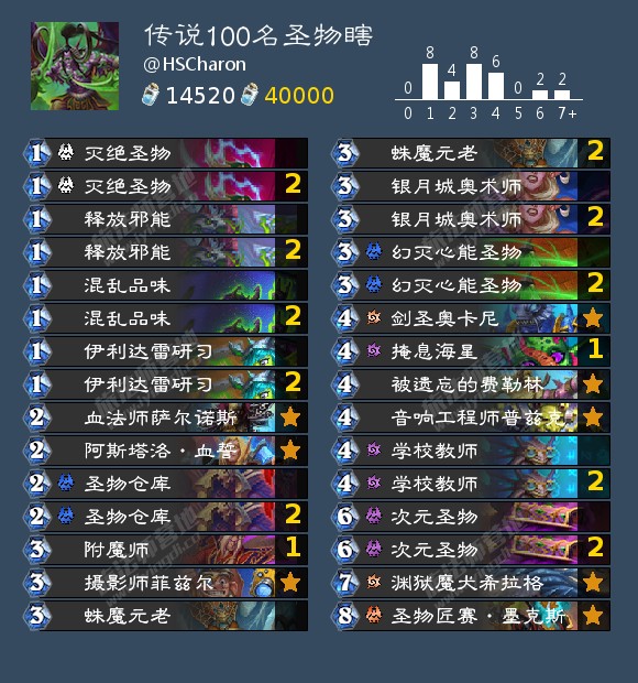 总结:从卡组数量上来看毫无疑问的是圣物瞎的数量最多,我个人在亚服传说段打下来感觉环境还是挺多样的,基本上什么卡组都有。顺带一提我还挺喜欢玩法术猎的,哈杜伦·明翼的入场语音"奥数之箭,折天而来!"听起来特别帅。帅的帅的。(关于每日小批量的卡组搬运我目前还没有特别好的计划,大家可以提提意见,比如在什么平台以什么形式投每日卡组)