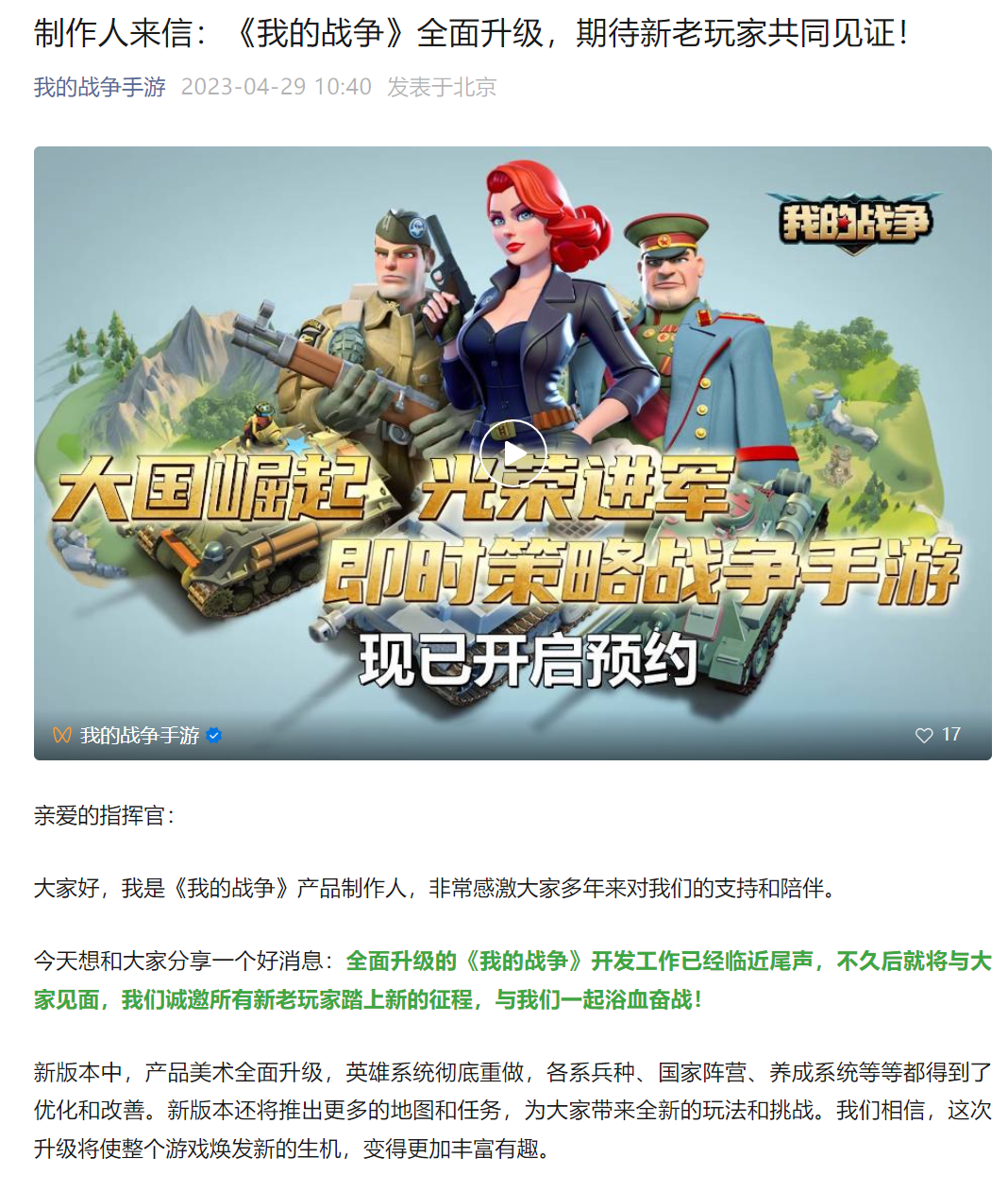比如盖娅互娱计划上线的SLG《我的战争》,这款游戏在2016年底上线,在iOS畅销榜上逐渐下滑到1000名左右,最终在2018年下架停运。今年四月份游戏宣布全面升级并计划重新上线,对美术素材和玩法进行优化升级,目前仍未开启过测试。