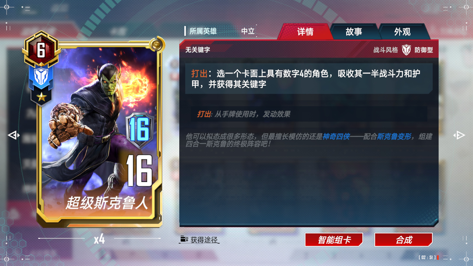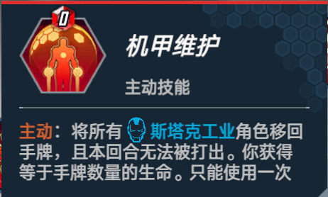 这个技能让我们可以回复10-13血,建议场上有钢铁侠角色的时候(尽可能给他带攻击武器),手牌保持10张以上,使用技能即可回复大量血
