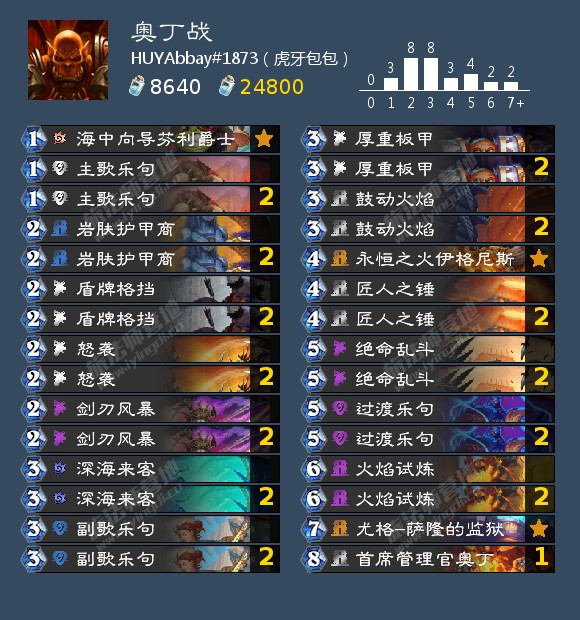 心得:这个卡组我觉得讨论的就两个点,一个是不带泰坦,一个是带了尤格萨隆的监狱。包包认为现在的环境并不适合带泰坦,对于现在的主流卡组,泰坦对机械贼是对局重要留牌的存在,但机械贼并没有占据绝对的数量,而且该卡组尽可能的压缩了随从的数量,保留了过牌探底等,保证了副歌乐句尽可能的抽到抽到首席管理员奥丁可以8费准时,甚至5费跳币上首席管理员奥丁的天局。首席管理员奥丁是卡组核心,泰坦是强势随从,只能说二者不可得兼,舍鱼而取熊掌。至于打控制牧和血dk这种劣势对局,容易出现卑鄙的脏鼠拉首席管理员奥丁的情况,有泰坦只能提高胜率而不能保证获胜,而环境下控制牧不多,血dk近期未见,衡量之下并不带泰坦。至于尤格萨隆的监狱嘛……主播需要有一定的娱乐性,并且总的来说地标还是蛮赚的,严重亏损情况不多。