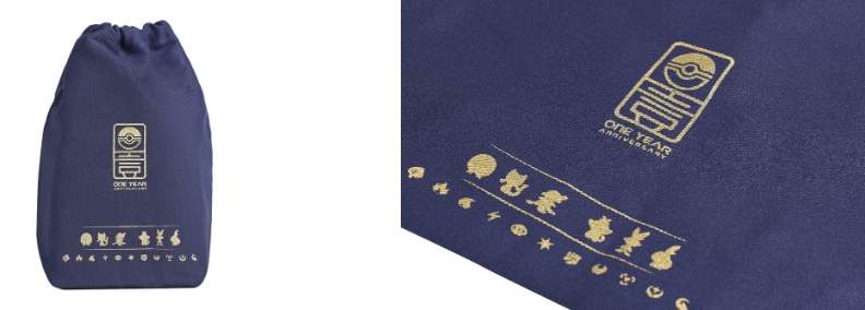 卡组收纳盒还配有专用收纳布袋,一周年纪念LOGO、“太阳&月亮”和“剑&盾”系列最初的伙伴以及宝可梦卡牌能量标志以烫金工艺印在深蓝色收纳布袋之上,这也是首次出现的卡组收纳盒专用布袋。