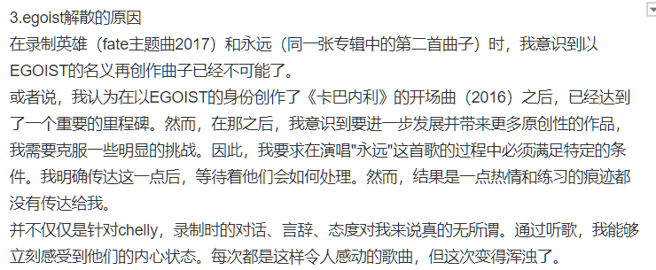 那么具体到底发生了什么事情,使得维持12年的EGOIST还是没能继续走下去,使得chelly(reche)像是如释重负一样告别呢?