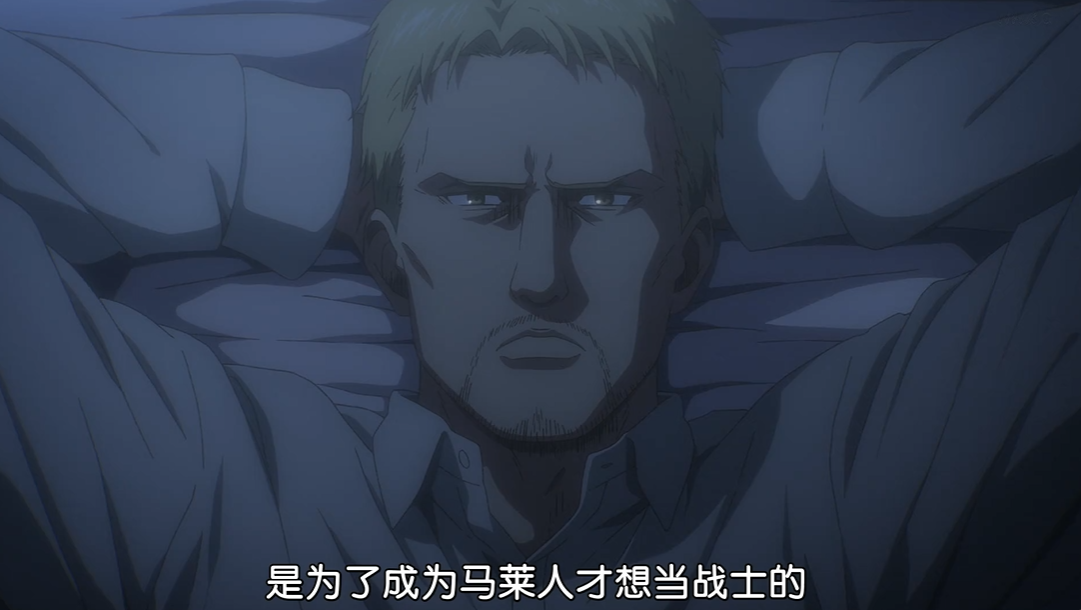 从第四季中的第二集开始(对应漫画第94章“墙里的男孩”),我们能看到莱纳的成长历程中充满了挫折和痛苦。他从一个想为自己和家人正名的年轻人,在经历了墙内的人情冷暖后怀疑起自己的目标行为和动机,在责任与自我的篡夺戏中逐渐变成了一个被责任和压力所压垮的士兵。