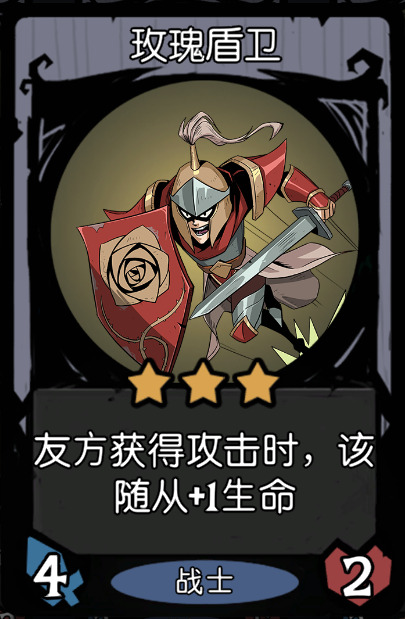 点评:战士中期的战力增加卡,个人认为主要还是养玫瑰盾卫会拿,或者场上盾还挺多的时候会暂时留着打工会儿,毕竟只加攻击力不加生命值,破绽比较多。
