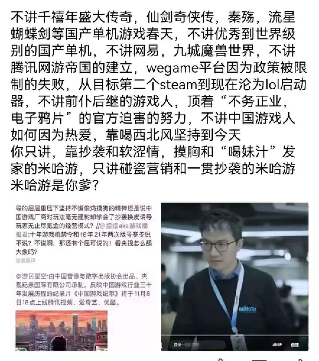 实际上,片子里一闪而过的也不仅有米哈游的大伟哥,还有金山的“中国第一程序员”求伯君、有创立中国第一款电子游戏杂志的边晓春,等等大佬多了去了——至少等到第二第三集出来了,你才知道人家聊没聊。等下周片子真聊这些了,再骂,不迟。毕竟,****。