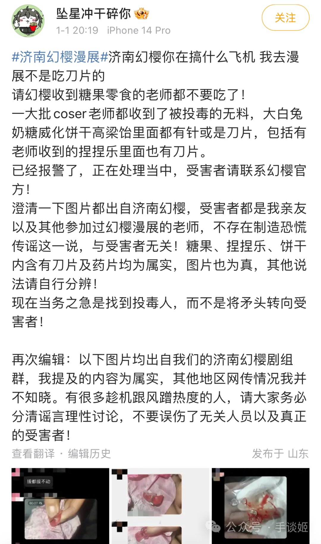 济南幻樱漫展的活动日期是12月30、31两日,在隔天1月1日,陆续在网上流传起“幻樱漫展无料的糖果零食里,藏有针头或刀片”的消息,并配有聊天记录和图片。一些血迹斑斑的图片看上去相当骇人。