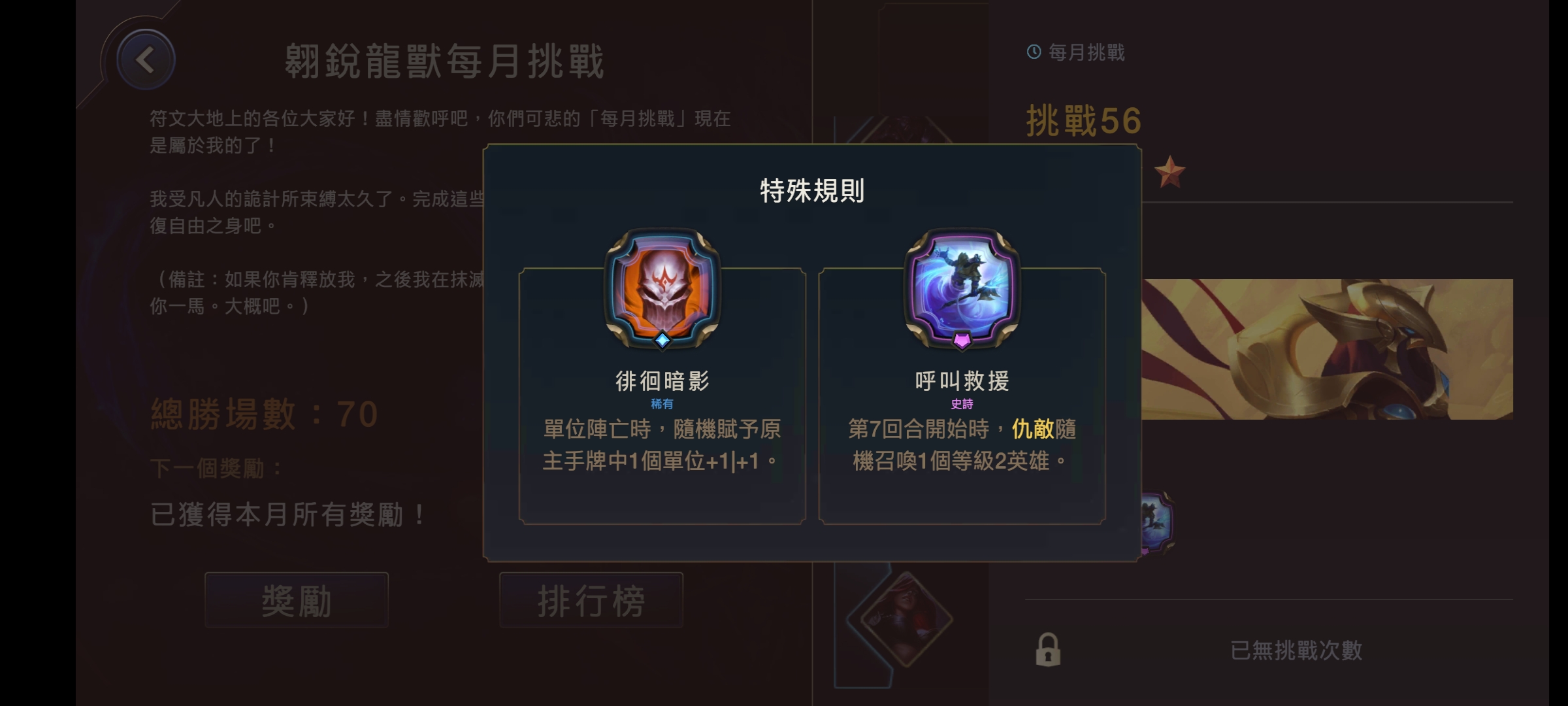 这个月的压力上的格外的早,你很难想象第18关就能出现巨神峰ez+刀妹的极品组合,看见巨神峰ez必须要尊重一下。回合开始的回蓝能让一些英雄用起来比较舒服,比如德邦兄妹。群友还推荐了狗熊,但我还没练。